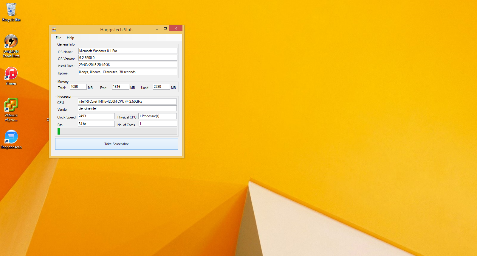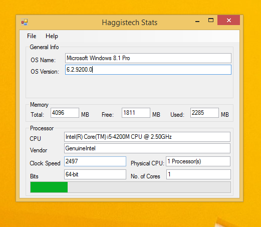 Haggis Veteran Posted March 31, 2015 Author Veteran Share Posted March 31, 2015 So i am thinking Computer Name Uptime Number of Reboots (if i can get this) OS name Installed Since total Ram used Ram Free Ram CPU Name Vendor clock speed cores Bar showing CPU use GPU name screen resolution Total HDD space HDD space Used HDD space free I will also add in options to screenprint the same as my linux one does anything else? goretsky 1 Share Link to comment Share on other sites More sharing options...