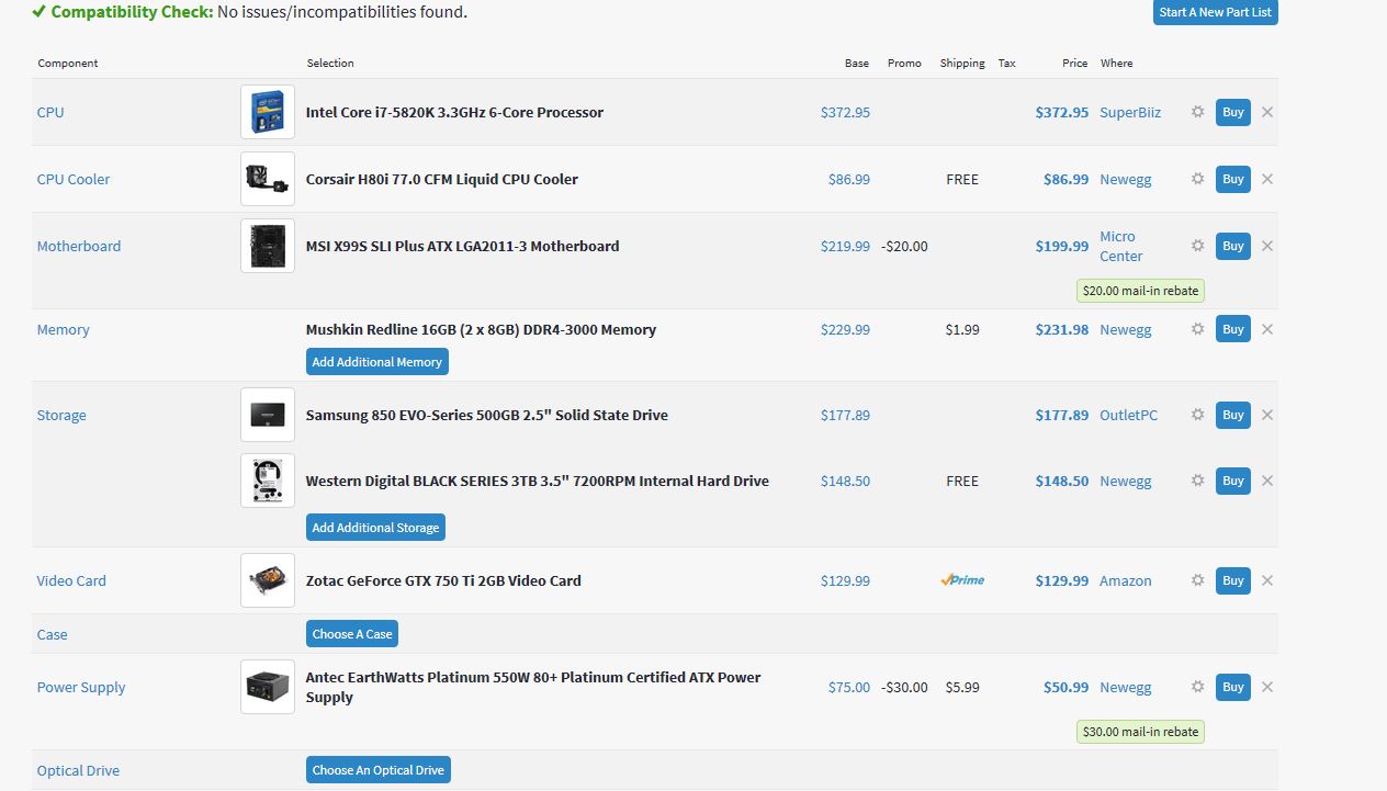 Yusuf M. Veteran Posted June 1, 2015 Veteran Share Posted June 1, 2015 I take it this is the latest list? Lots of things you could cut for a more reasonable price. - Why do you even need a custom air cooler if you're not overclocking? And if you must really have one just get the cheap universally acclaimed Hyper 212 Evo. - You certainly don't need an 860W PSU, even 500W should suffice unless you plan on adding a second video card, in which case you still don't need a 860W PSU, 750W max should do. - Getting the Asrock Extreme6 motherboard - can you identify what features of this specific model you want that justify paying for that instead of, I don't know, the Extreme4 for instance? Or the many other cheaper options that still have plenty of SATA ports and support for all your components? - Great choice of video card, but do you actually plan on gaming with this build? Glad to see another recommendation for the Cooler Master Hyper 212 Evo. You're definitely right. A lot of the items in that list are unnecessary. I was under the impression that it won't be used for gaming but the inclusion of a GTX 970 makes me think he changed his mind. If it isn't a gaming build, then he can save a lot of money with an mATX build. A cheaper and smaller motherboard means a cheaper and smaller case. Speaking of cases, $189 is pricey even for a gaming build. Link to comment Share on other sites More sharing options...