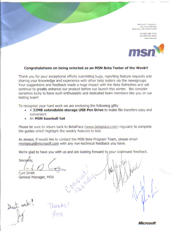 Jish Posted December 25, 2003 Author Share Posted December 25, 2003 You bet! MSn is doing a lot these days and it's becoming a mjor section of Microsoft...All those goodies are promoting the brand and I think this is good.What do u mean withthe certificate of participation? you mean the certificate that came with the CD? As for the reference number...I dunno what it means...well the number on your certificate is personal...I'm actually wondreering how many Bts were enrolled in the program...if you speak about the number on the package I guess it is to keep track of the mailing status of the package Yeah, the certificate that came with the cd. As for the certificate number, it is #00046 Link to comment Share on other sites More sharing options...