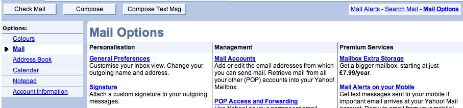 Winston Posted December 27, 2003 Author Share Posted December 27, 2003 I use yahoo mail over POP3... my mail server is pop.mail.yahoo.co.uk you need to go into yahoo Mail, then options, then Email forward/pop access... select pop access and then it gives you, YOU'RE server settings, maybe its .au or something... take a look. man all the help guides say go to options on the left side and im like wat options i only see Mail Options on the top right. Link to comment Share on other sites More sharing options...