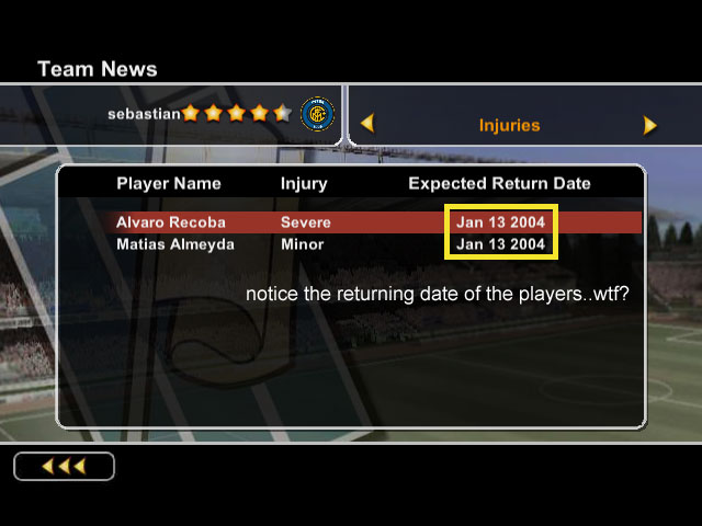 sebaz Posted December 28, 2003 Author Share Posted December 28, 2003 whats wrong with those dates?and btw the 3rd pic - happens in a lot of games :/ Yea i noticed..but when u supposedly create a realistic football game having goal keepers going though the net to save a ball thats going outside anyways its kinda hmmmm ok... About the date..well im playing the 2005 season yet look when the players are coming back...FIFA is goin back in time Link to comment Share on other sites More sharing options...