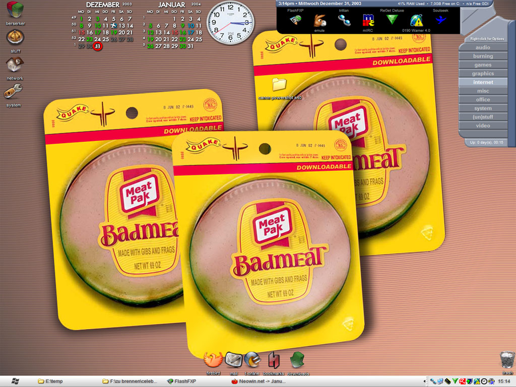 QuaKeD Posted December 31, 2003 Share Posted December 31, 2003 Still dec in Argentina :) But the desktops won't change tomorrow, so... First PC: Second PC: Link to comment Share on other sites More sharing options...
