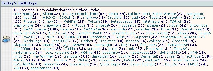 Steven Posted January 1, 2004 Share Posted January 1, 2004 :blink: :no: :no: uh Happy Birthday to all 100+ of You? :huh: Today's Birthdays 111 members are celebrating their birthday today User Name(34), Silent(33), J-P, Lynchmob, jimf1(58), ebola(54), Lakitu7, kin0, Silent-Warrior(29), wangame(27), nsplit(24), AlleXXX, COOLEY(49), maffyoo(31), Crucible(32), auth(20), Tapek(24), sputnik(24), shodan(28), Proteus(34), hwk(34), WildFish(27), Tekzilla(20), betabuzzboy(17), fatlittlepig(44), T@RicK(34), crackwhore(24), crapwhore(24), virtuous(34), cmosbjt(26), hussain22(26), jcoates(24), x10an(42), JnCoKiLLa(23), bat13, unspec(100), Benkan(18), AAAAAAA(36), alaboody(27), schrillen(20), Toker(34), Sinikal, iisiis(38), blackcomb2k5(17), $ e 7 e |n|(26), Undefined6400(19), breaktherulez(17), mitul_mehta(27), zhaox(28), xdude6(23), max65(39), Viruz(16), ELDER2K(38), Shotendo(96), kilist(28), Supcom1(42), sdredrewwe, wilsons1179(25), DarkSiege(18), robert1957(47), ziddey(2), Radiation(18), Baboon(26), callinas(24), CrooKed(29), Diapasonic(25), retard(28), ja_7, tzvtzv(26), msthiyagu(23), RayX(34), fish_curry(28), RadiationXP(18), idee2000(44), longterm(26), TajMex(35), snotson(3), gcool(24), ruiN-(32), Holograph(54), MbayAQ, rayfaramarzi(44), cox, xplearner(40), 404file(43), bsodmike(21), masterboga(20), defiant1981(24), YAH(28), mrdb(27), The Whiffler(19), Gangster(101), dark5ider(16), buzlink(22), Semental(21), Ihasn(24), exthuse(100), Morphie(24), Slither(23), Ozzamm(25), FoSsiL(22), dlinkwit27(19), Wrath Delivery(24), m2x-ADMlN(18), alpmurat(24), lzydesmond(24), Count Spatula(17), Hai_Do(16), TAREK(24), Y2K(15), angelrendon(19) Link to comment Share on other sites More sharing options...