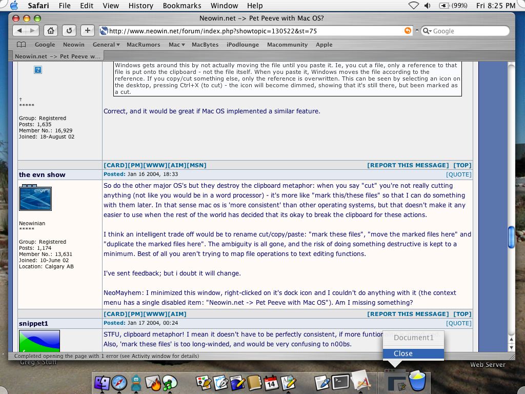 Morphie Posted January 16, 2004 Share Posted January 16, 2004 I am really surprised nobody mentionned the lack of CUT FUNCTION FOR FILES. Sure, I love doing copy paste on files, but sometimes i'd like to be able to cut and paste them. Someone once explained to me on the forums that doing so would break the "clipboard methaphor" but it did not make much sense, and I'd rather have functionality than being true to a methaphor ;) You will likely never be able to do this. I wanted this also, but I understand why Apple has chosen not to put this in here. The reason is the clipboard argument: If you cut a file in the finder, and then you cut a line of text from your word document, the file is gone. Snap, gone, bg, dead. That isn't good, and there are going to be a lot of people doing that all of the time, or at least performing similar actions. It isn't worth having that feature for all of the bad ends it can bring to an OS, especially one trying to be friendly to everyone. If you think about it, it makes sense, and trust me it isn't coming anytime soon. My biggest pet peeves with OS X: IChat's extra strong chat spam filter, it's just a dash harsher than AIM, and it annoys me. The finder. There is just too much wrong with it to even start. It drives me crazy, although I think it has the potential to get better, and it certainly beats windows w/o even trying. The resizing thing only on lower right is the worst thing ever I agree, I don't know wtf they are thinking, I guess they don't want those little tread things on every corner. I like that the windows don't go above the top of the screen, except KDX and other UI guidline breakers, those can all go to hell. I don't think I need full screen, unless it's a movie or something, and they all do that, but I suppose it'd be nice to have that as a feature, why not right? My only other major peeve is the tiny gap in itunes and ipods when playing continuous mix mp3's that are tracked out, but that's a problem with the mp3 format itself so I guess that can't be their fault, but it makes me want to kill someone. **To the poster of control-right arrow and control-left arrow: THANK YOU, I don't know how I didn't know this before, but that makes me very happy, it was litereally the one thing really missing, hah. Link to comment Share on other sites More sharing options...