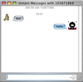 SPeedY_B Posted January 31, 2004 Share Posted January 31, 2004 Just had a quick experiment with this idea. I added my ICQ number to iChat, logged into ICQ.. iChat said I was offline. I added my iChat/AiM to ICQ and ICQ saw me as being online. I attempted to talk to myself (mmm, tastes like insanity) the message from ICQ reached iChat, but I could not reply as I was "offline" I removed the ICQ number from my iChat buddies, then tried again, I could then reply. So in summary, you can talk to someone on ICQ, however you can't add them to your buddy list (as they would never be online anyway, so there's no point in it) and the ICQ user needs to initiate the conversation. As I say, this was real quick as I was just curious.. further faffing may reveal more :D Link to comment Share on other sites More sharing options...