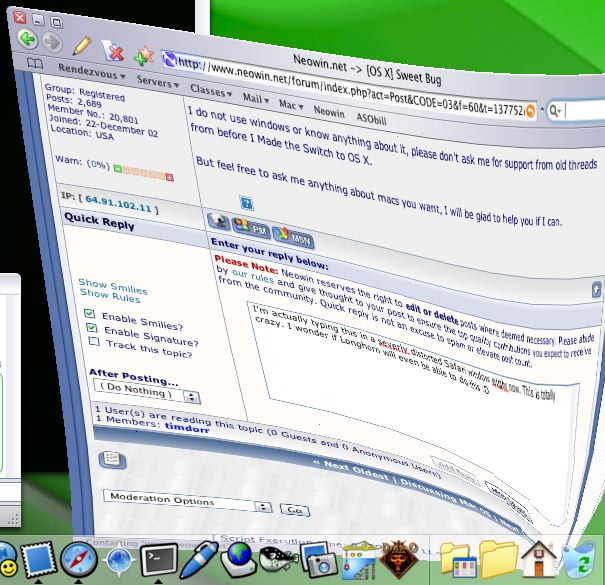 macman87 Posted February 3, 2004 Share Posted February 3, 2004 this is sick... my safari window has gone abit distorted right no but..omg! i like this bug :D Link to comment Share on other sites More sharing options...