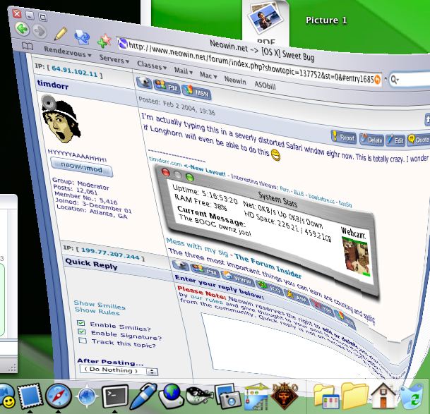 oldaccount1 Posted February 3, 2004 Share Posted February 3, 2004 I'm actually typing this in a severly distorted Safari window eighr now. This is totally crazy. I wonder if Longhorn will even be able to do this :D longhorn will do a whole lot more, baby Link to comment Share on other sites More sharing options...