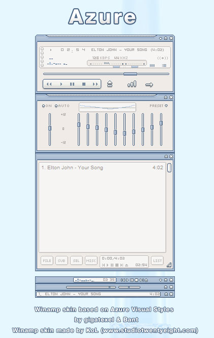KoL Veteran Posted February 7, 2004 Veteran Share Posted February 7, 2004 Here's Azure winamp skin. I hope you like it :smile: Thanks a lot to gigatexel for permission. Download: http://www.deviantart.com/deviation/5143321 Link to comment Share on other sites More sharing options...