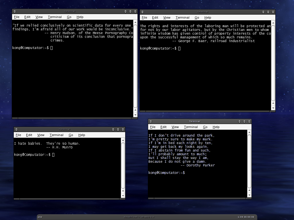 kongit Posted March 3, 2004 Author Share Posted March 3, 2004 here is one with the four font setting seen in the terminal. Link to comment Share on other sites More sharing options...
