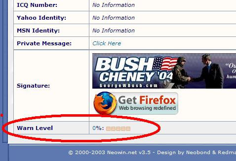 HoochieMamma Posted March 4, 2004 Share Posted March 4, 2004 I want to know what the "warn" thing at the bottom of my avatar is? (came out of nowhere a couple of days ago) PS: Huh just saw its gone what happened to it? Link to comment Share on other sites More sharing options...