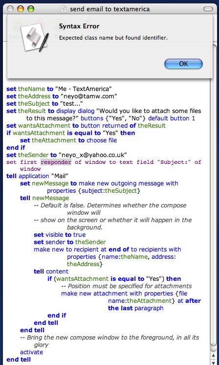 Steve Posted March 14, 2004 Author Share Posted March 14, 2004 (edited) Ok, i tried it myself, this is much better... set theName to "Me" set theAddress to "neyo_x@yahoo.co.uk" set theSubject to "test..." set theResult to display dialog "Would you like to attach some files to this message?" buttons {"Yes", "No"} default button 1 set wantsAttachment to button returned of theResult if wantsAttachment is equal to "Yes" then set theAttachment to choose file end if set theSender to "neyo_x@yahoo.co.uk" tell application "Mail" set newMessage to make new outgoing message with properties {subject:theSubject} tell newMessage ?set visible to true ?set sender to theSender ?make new to recipient at end of to recipients with properties {name:theName, address:theAddress} ?tell content ? if (wantsAttachment is equal to "Yes") then ? ?-- Position must be specified for attachments ? ?make new attachment with properties {file name:theAttachment} at after the last paragraph ? end if ?end tell end tell activate end tell That is pretty much all I want. Colin, if you know how I can have the 'Subject Line' Field Highlighted, after it composes the email, that'd be great... thats the ONLY thing I'd like to:)hange... :) Thanks for introducing me to this stuf:)tho! :) Worth learning I guess... Edit: So it'll probably invoke this... but i am not sur:(how! :( (thanks for the hookup Josh) tell window "user information" set first responder to text field "user name" end tell Edited March 14, 2004 by ~~NeYo~~ Link to comment Share on other sites More sharing options...