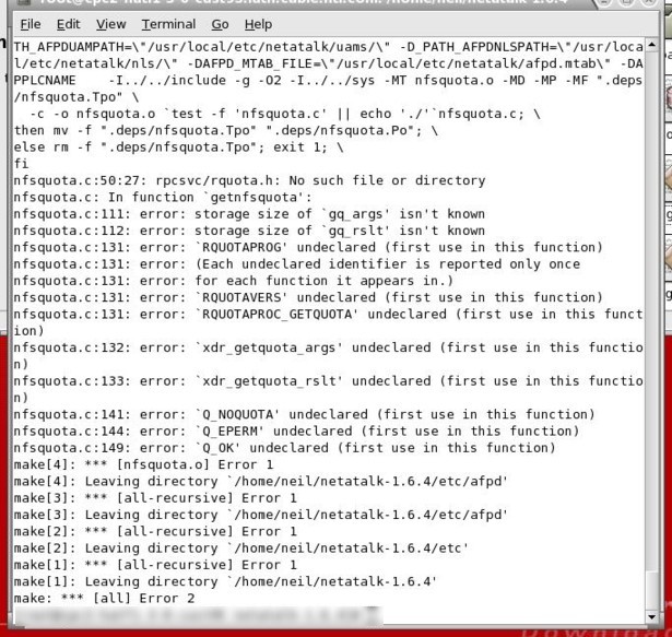 mcnelson Posted March 29, 2004 Author Share Posted March 29, 2004 (edited) OK, so installing 'netatalk' is an herculean task. I can't install either of the two most recent RPMs for Mandrake ( I get the following 2 errors, 1 for each: 'unsatisfied cracklib-devel', and 'unsatisfied pam-devel'). So, I get the sourcefile and run ./configure.....then it tells me I need the Berkeley DB libraries, which I duly go off, find and install. It still tells me I need them, so when I run the ./configure command again there is a switch to tell it the path of the Berkeley DB libraries....all ok so far, and it seems to work now. However, after running 'make' I get a bunch of 'error 1' and 'recursive errors'! Dammit, is NOTHING simple with Linux?????? :angry: edit: terminal output: Edited March 29, 2004 by mcnelson Link to comment Share on other sites More sharing options...
