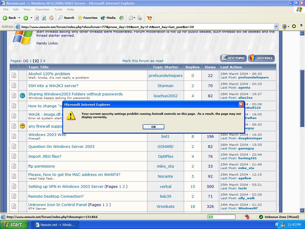 mipra Posted April 2, 2004 Share Posted April 2, 2004 Indeed....try to make the security to default medium. That will do it Link to comment Share on other sites More sharing options...