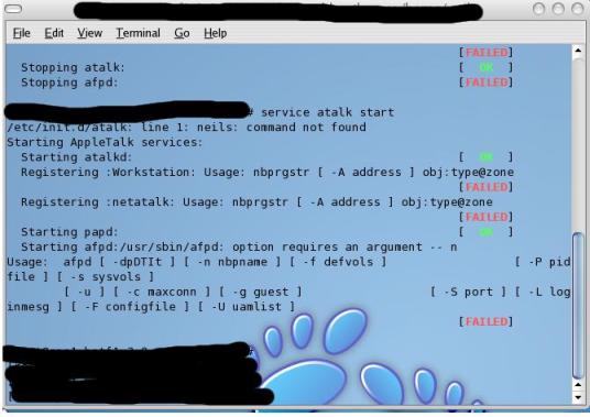 kemical Posted April 22, 2004 Share Posted April 22, 2004 is the service running? are the modules installed? lsmod | grep -i apple ps aux | grep atalkd Link to comment Share on other sites More sharing options...
