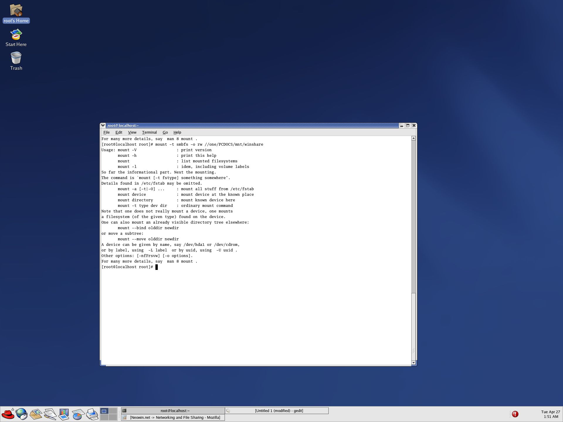 markwolfe Veteran Posted April 27, 2004 Veteran Share Posted April 27, 2004 Ok. What files? On a local drive (like you dual-boot and want to access your Windows files)? Or on another computer? I think you mean another computer, so you will need to connect with samba mount -t smbfs -o rw //win_pc_name/share_name /mnt/linux_mount_point and change your win_pc_name, share_name and linux_mount_point to whatever you have on your PCs. There is probably a graphical method of browsing the SMB shares, but I don't know what that is (plus, which version of RedHat are you using?) Link to comment Share on other sites More sharing options...