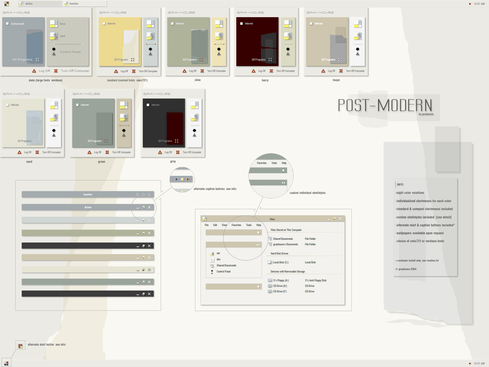 grayhouse Posted April 30, 2004 Share Posted April 30, 2004 I thought I would never finish this thing, but I did. You'll notice that it's changed quite a bit from the WIP, but when you're working on 2 styles at the same time thats to be expected. Frankly I think it's better for it. You'll notice that it comes in two versions. postmod1 here standard startmenus. postmod2 here compact startmenus I would have put the two together but the file was just to damn large. Be sure to checkout the readme included in both speacialy reguarding font choices for those that don't like the standard font Swis 721. enjoy :) Link to comment Share on other sites More sharing options...