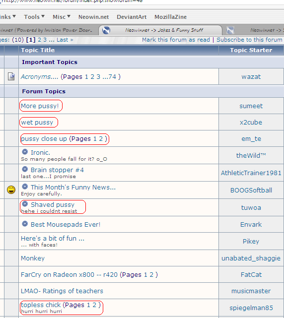 zhangm Supervisor Posted May 2, 2004 Author Supervisor Share Posted May 2, 2004 Yeah... Notice that strategy isn't working out well... *Edit: Locking them all would make them drop off much faster, but seeing as how that is a pretty extreme measure to take against jokes (I use that term loosely), why can't a mod merge them into something like The Big ###### Thread, or something similar? Link to comment Share on other sites More sharing options...