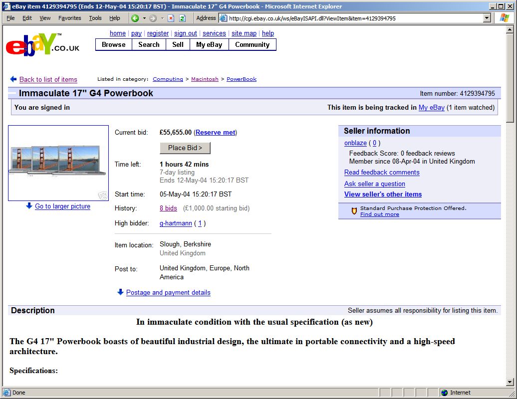 Pilsbury Posted May 12, 2004 Author Share Posted May 12, 2004 Not a mistake as such, they messed up his auction no end... Date of Bid Bid Amount 07-May-04 21:16:54 BST ?55,655.00 07-May-04 21:16:44 BST ?55,555.00 07-May-04 21:16:31 BST ?44,344.44 07-May-04 21:16:14 BST ?33,333.00 07-May-04 21:16:12 BST ?22,222.00 07-May-04 21:15:23 BST ?11,111.00 07-May-04 21:14:55 BST ?1,333.00 07-May-04 21:14:46 BST ?1,111.00 Link to comment Share on other sites More sharing options...