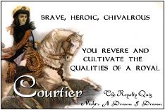 habtro Posted June 5, 2004 Share Posted June 5, 2004 You are a Courtier! Brave, Heroic, Chivalrous You revere and cultivate the qualities of a royal! You identify strongly with fantasy and royalty and are a deep and intelligent person. Idealistic and romantic, you tend to live in your own world, apart from the harsh realities of life & strive for the ideals and values that the once great royal hierarchy established. Link to comment Share on other sites More sharing options...