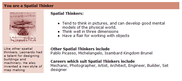 ramesees Posted June 5, 2004 Share Posted June 5, 2004 :D Logical-Mathematical thinkers: Like to understand patterns and relationships between objects or actions Try to understand the world in terms of causes and effects Are good at thinking critically, and solving problems creatively Like Logical-Mathematical thinkers, Leonardo based his theories on evidence rather than speculation. Other Logical-Mathematical Thinkers include Isaac Newton, Archimedes, Albert Einstein Careers which suit Logical-Mathematical thinkers include Physicist, Chemist, Biologist, Lawyer, Computer programmer, Engineer, Inventor :D Link to comment Share on other sites More sharing options...