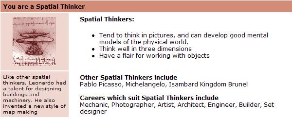 Schmoove Posted June 5, 2004 Share Posted June 5, 2004 I am a spatial and a existential thinker. You can compare me to Pablo Picasso, Michelangelo, Isambard Kingdom Brunel, The Buddha, Gandhi, Plato, Socrates and Martin Luther King. I'm definitly in good company (Y) Link to comment Share on other sites More sharing options...