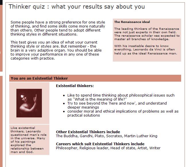 harleydog Posted June 5, 2004 Share Posted June 5, 2004 You are an Interpersonal Thinker Interpersonal thinkers: Like to think about other people, and try to understand them Recognise differences between individuals and appreciate that different people have different perspectives Make an effort to cultivate effective relationships with family, friends and colleagues Like interpersonal thinkers, Leonardo had lots of friends and contacts, and was a popular figure at the Italian court. Other Interpersonal thinkers include Winston Churchill, Mother Teresa, William Shakespeare Careers which suit Interpersonal thinkers include Politician, Psychologist, Nurse, Counsellor, Teacher Link to comment Share on other sites More sharing options...