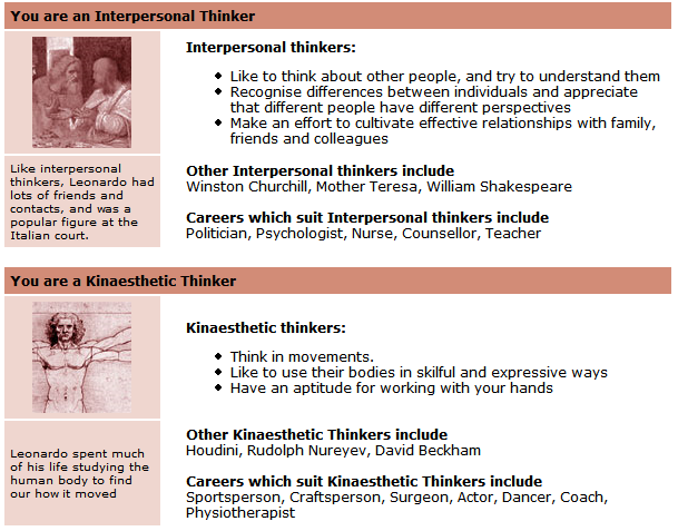 goheels681 Posted June 5, 2004 Share Posted June 5, 2004 You are an Interpersonal Thinker Interpersonal thinkers: * Like to think about other people, and try to understand them * Recognise differences between individuals and appreciate that different people have different perspectives * Make an effort to cultivate effective relationships with family, friends and colleagues Like interpersonal thinkers, Leonardo had lots of friends and contacts, and was a popular figure at the Italian court. Other Interpersonal thinkers include Winston Churchill, Mother Teresa, William Shakespeare Careers which suit Interpersonal thinkers include Politician, Psychologist, Nurse, Counsellor, Teacher Link to comment Share on other sites More sharing options...