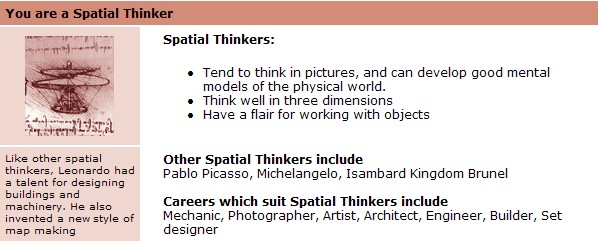 Dallas Posted June 6, 2004 Share Posted June 6, 2004 holy crap this is TRUE :o Spatial Thinkers: * Tend to think in pictures, and can develop good mental models of the physical world. * Think well in three dimensions * Have a flair for working with objects Other Spatial Thinkers include Pablo Picasso, Michelangelo, Isambard Kingdom Brunel Careers which suit Spatial Thinkers include Mechanic, Photographer, Artist, Architect, Engineer, Builder, Set designer Link to comment Share on other sites More sharing options...