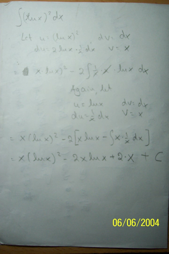 dduardo Posted June 6, 2004 Share Posted June 6, 2004 Look at the problem as ln(x) * ln(x) Therefore: u = ln(x) du = 1/x dv=ln(x) v=x*ln(x)-x Now plug it into the equation and you can figure it out from there Link to comment Share on other sites More sharing options...