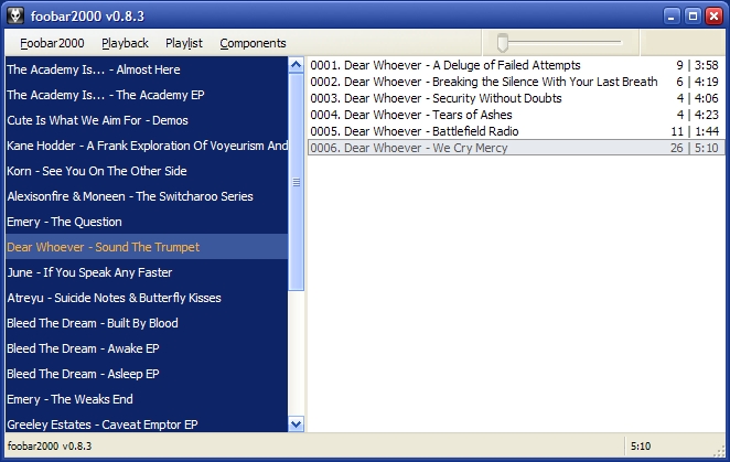 brumal Posted December 28, 2005 Share Posted December 28, 2005 Am i the only one who applies Brumus's config, and nothing changes but the colors of the tracklisting? I'm phsically unable to drag the controls to bottom, or anything to the left for that matter. some help would be great because this is annoying me quite a bit :) My config is just for the playlist view and track info panels. It's not meant to change the layout of the GUI. Check out the link below for info on using ColumnsUI. ColumnsUI Wiki Link to comment Share on other sites More sharing options...