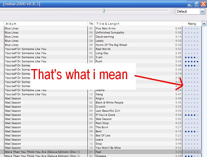 Only in beer we trust :-) Posted January 23, 2006 Share Posted January 23, 2006 I've posted it 3 times until now(i think :huh: )has anybody a rating plugin in his foobar? if yes than could you please tell me how to configure it right to see a rating column in the playlist. I've found a picture of a foobar config with rating column via google and that's what i'm looking for.....for my foo. :shiftyninja: :cool: :shiftyninja: Link to comment Share on other sites More sharing options...