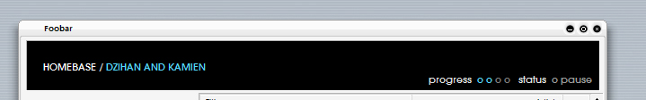 dose Posted February 28, 2006 Share Posted February 28, 2006 Hey guys sorry about the noob post here but I am a foobar virgin whos having some trouble with customizing its appearance. I absolutely love Psyphre's foobar look and I am trying to replicate it on my own system. I think I have all of the components downloaded and installed correctly, but even after two hours of reading various forums and sites I really don't know what I'm doing. I have imported the .fcs file but do i need some sort of graphic for the top bar part? Sorry for wasting space here I'm just real confused Link to comment Share on other sites More sharing options...