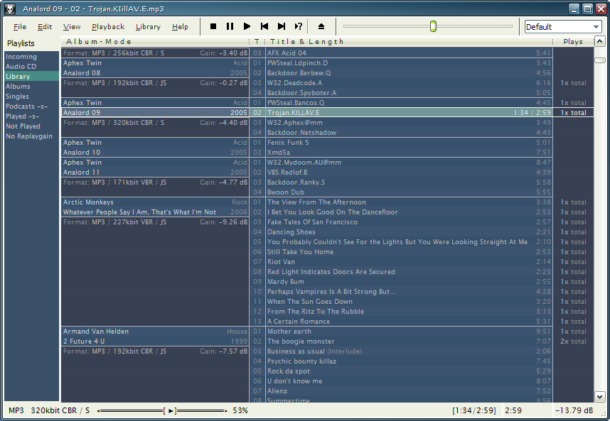 +unabatedshagie Subscriber¹ Posted February 28, 2006 Subscriber¹ Share Posted February 28, 2006 Even though I have posted in this thread lots of times I don't remember ever posting a pic of my foobar, well here it is. I'm using the newest release candidate with Navigator_1.4.0beta3 fcs, the playlists under library playlist are all autoplaylists. Can't wait till foobar goes final and the SDK gets released so I can get a few more components like tabs, albumart etc. Link to comment Share on other sites More sharing options...