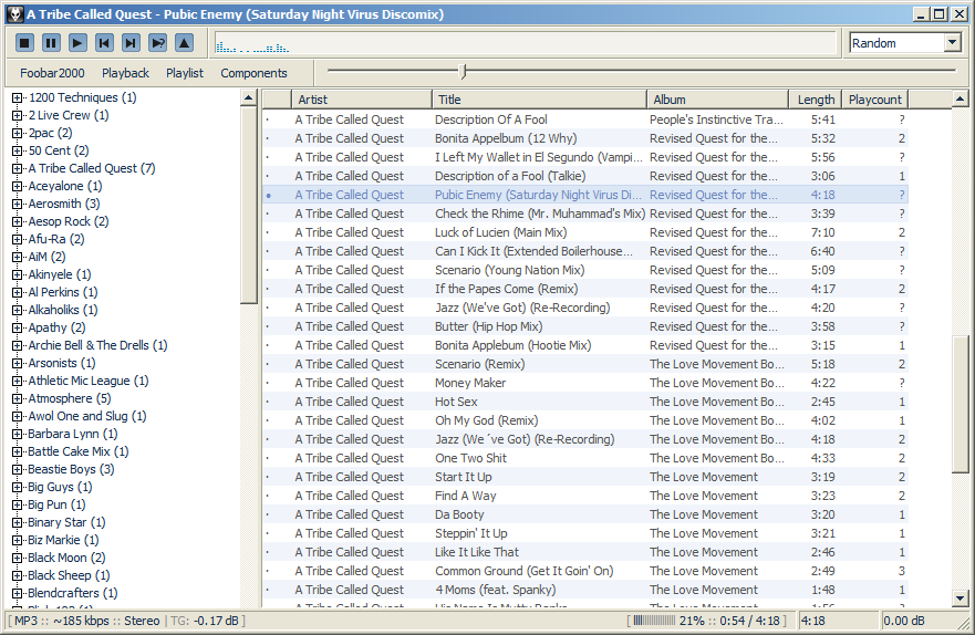 helig Posted March 12, 2006 Share Posted March 12, 2006 Now I have been playing around with foobar2k for a few days and my previous post showed foobar2000 0.9RC at my laptop, now here I come with my customized foobar2000 0.8.3 at my home workstation, widescreen config: I actually think it's nice.. :D what do you guys think? any proposals? Link to comment Share on other sites More sharing options...