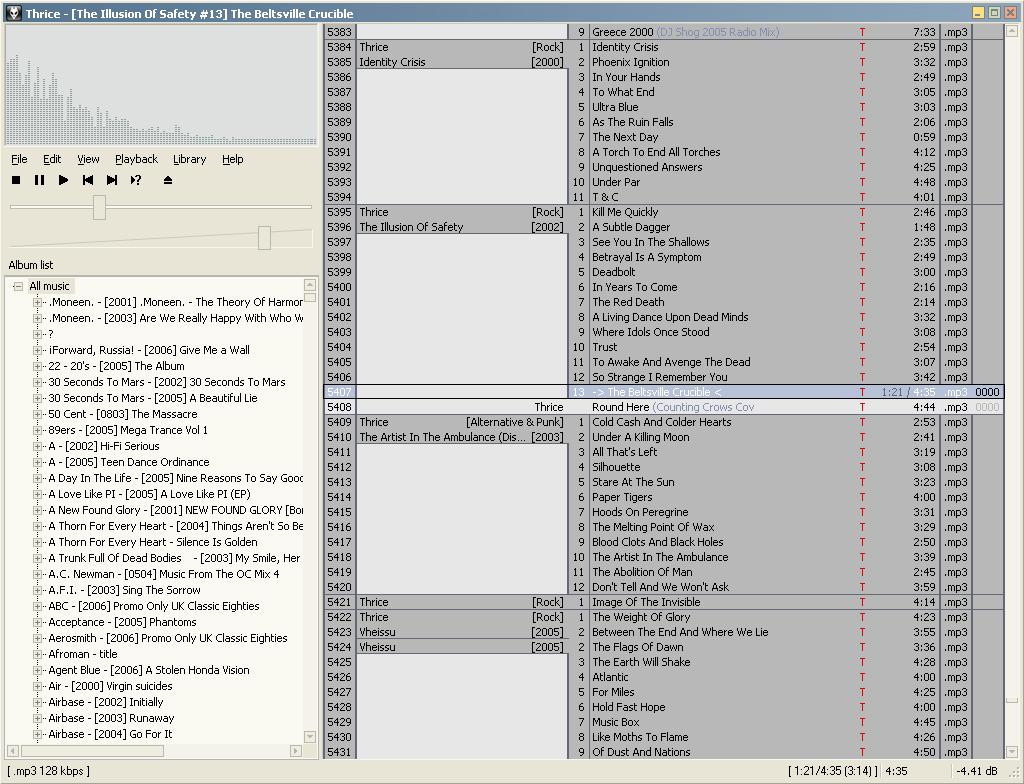 phend-one Posted April 9, 2006 Share Posted April 9, 2006 (edited) My config (could still do with some tweaking): Now, a question. Is there a way to stop the Album List Panel from adding items to the playlist when I single click on the entries? I'd like it to expand on single click instead. Thanks in advance :) What VS/WB skin are you using? Edited April 9, 2006 by phend-one Link to comment Share on other sites More sharing options...