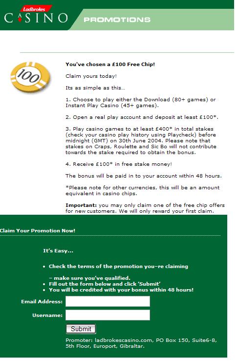 hobsgrg Posted June 15, 2004 Share Posted June 15, 2004 Just got this email this morning"Dear Customer Thank you for choosing to play at Ladbrokescasino.com. As you know there were some recent changes to our terms & conditions on our Introductory offer which would have excluded yourself from being paid, but we have noticed that you opened your account before the updated terms & conditions were in place so we are pleased to say the Introductory offer has now been paid in to your account. Please note you must turn this bonus payment over 4 times before withdrawing or you will be excluded from any future Promotions " And its there, just a shame that soemone removed the instructions that I cant remember now on what to do for the auto play and what game etc Glad Ladbrokes have paid out like they should of done, just turn your bonus into chips then back again and withdraw it. I did that and got the money into my account no problem, unless you want to be able to take part in future promotions and risk losing some of your extra money. Link to comment Share on other sites More sharing options...
