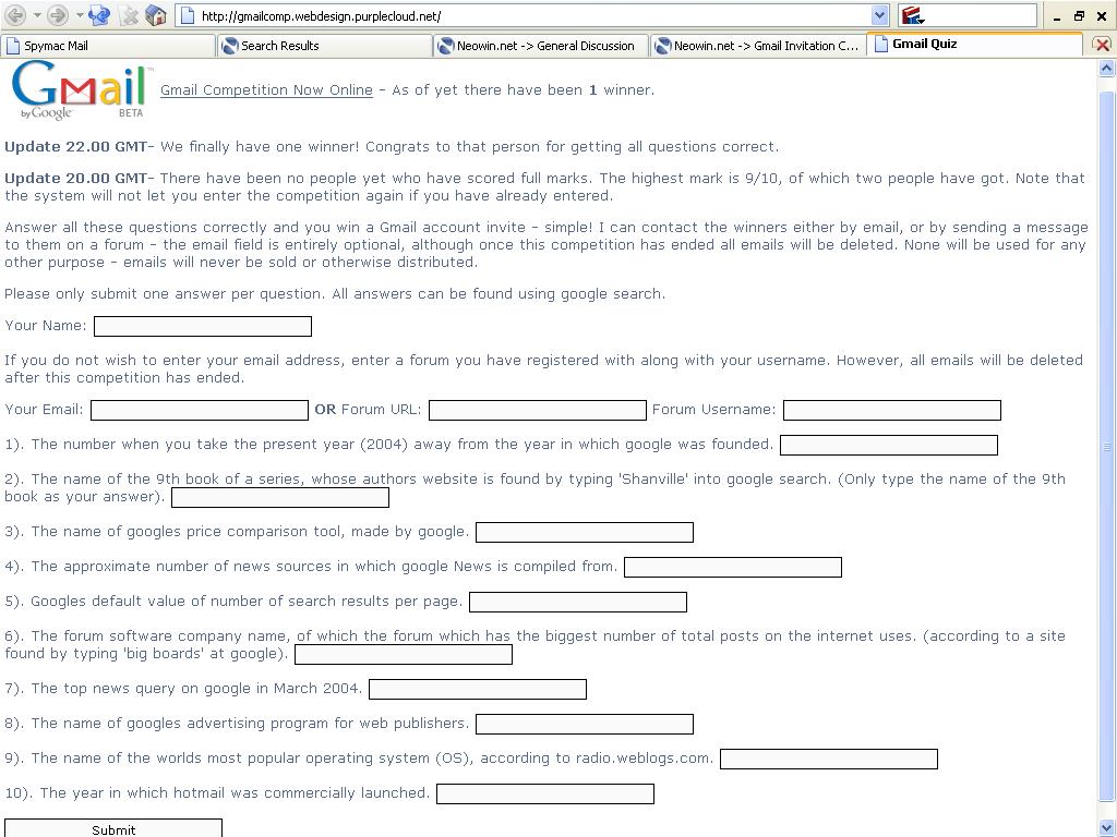 t|m Posted June 10, 2004 Share Posted June 10, 2004 Hi, If you do not yet have a Gmail competition, then tomorrow there will be a change for you to get one. At 5pm BST, there will be a competition consisting of 10 questions, available from http://gmailcomp.webdesign.purplecloud.net, or http://webdesign.purplecloud.net. The competition will consist of 10 questions, with the first two people getting 100% correct to get a Gmail invitation each. You can be reminded when the competition is going to start - simply go to one of the url's and enter your email in the box shown. Just thought this would be a better way of giving away email accounts rather than selling them or whatever. t|m Link to comment Share on other sites More sharing options...