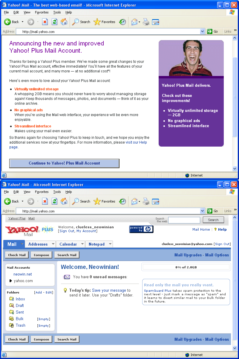 Xenomorph Posted June 15, 2004 Share Posted June 15, 2004 ok, my 25 meg account was just upgraded to 2 gigs. for some reason, after using the web mail for a few minutes, clicking "Inbox" presented me with a "welcome to Yahoo Mail Plus!" or something screen. i had to log out, and then back in to see the changes (2 gigs space, no ads) Link to comment Share on other sites More sharing options...