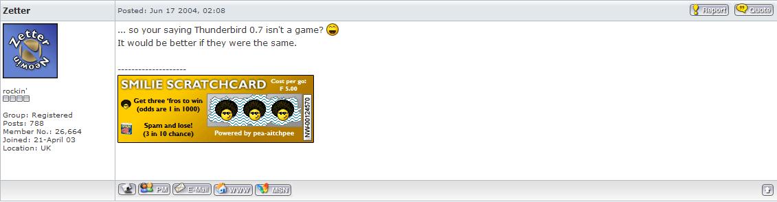 Zetter Posted June 17, 2004 Share Posted June 17, 2004 ... so your saying Thunderbird 0.7 isn't a game? :laugh: It would be better if they were the same. Link to comment Share on other sites More sharing options...