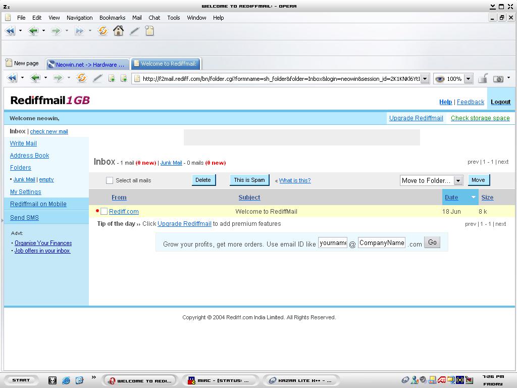 hahacar Posted June 17, 2004 Author Share Posted June 17, 2004 don't give rats ass even if every single other email provider in the world will begin offering 1gig emails.this is some no-name crappy host that installed crappy looking webmail script and made quota of 1gig. big freakin deal. i wouldn't trust it even w/ my spam email. For your kind information Mr. Rediffmail is INDIA's fastest email services since last 5 years. And its Inbox is way better than any other spymac(1gb) or aventuremail(2gb). Link to comment Share on other sites More sharing options...