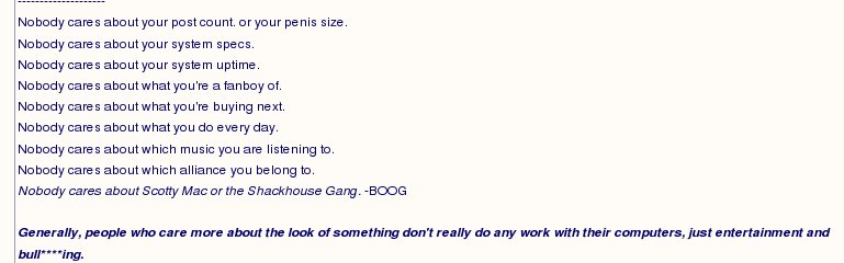 bangbang023 Veteran Posted July 2, 2004 Veteran Share Posted July 2, 2004 I don't use signatures. Don't really understand them. But, I have been on sites that limit signatures to say 5 lines, some 10 lines, and those limits seem to help. I think 5 lines of the default font size and color (no large, pink fonts, for instance) would be reasonable. I didn't even realize you could have graphical sigs here, and had no idea they could be so huge. I guess I browse without Avatars and Signatures so I never really noticed. I think I would go for a 300 wide by 100 tall as a good limit for graphical sigs. Sounds about right. But that is why I'm just a user and not a site runner or moderator. :)Is there a limit on the number of text lines and text sizes for signatures here? I did not see it right off in the link above. Thanks, BK the basic rule about text sigs is that they do not go longer than an image at 170 pixels would. If it seems close to me, I take a screen shot, cut the signature and then measure it to see how big it really is. Link to comment Share on other sites More sharing options...