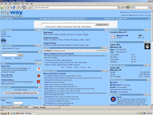 EmuZombie Veteran Posted July 5, 2004 Veteran Share Posted July 5, 2004 wow, i thought everyone except me had forgotten about myway.... for those who don't remember, or those who never heard of it, it's like Yahoo, only without banner, flash, and pop-up ads They even have the "My" home page thing like Yahoo Link to comment Share on other sites More sharing options...