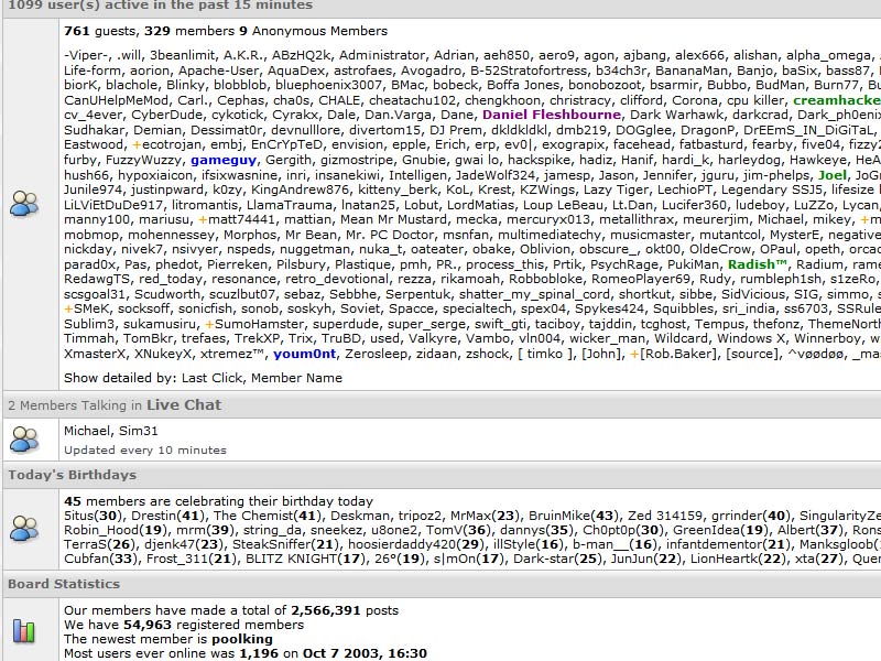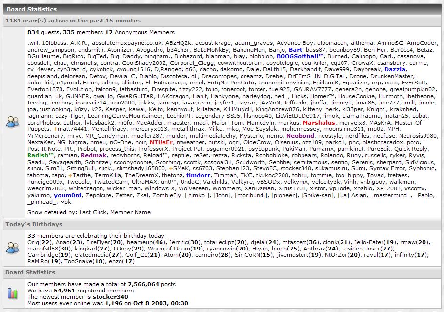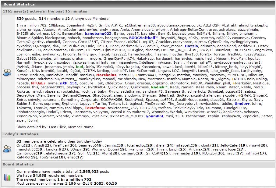 Hankyone Posted July 31, 2004 Share Posted July 31, 2004 any1 took a screenshot? whoa! in 2003 Most users ever online was 1,196 on Oct 7 2003, 12:30 Link to comment Share on other sites More sharing options...