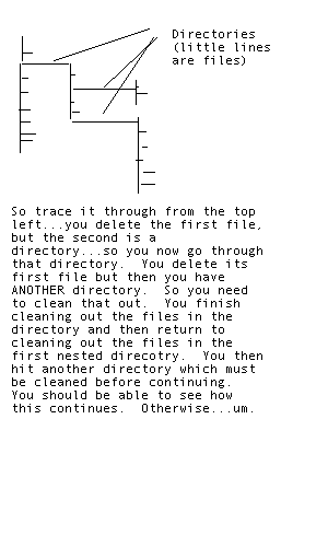 0 darkmark327 Posted September 26, 2004 Share Posted September 26, 2004 Stack overflow is not very likely. Consider a binary tree (tree with at most 2 children). Suppose you have 4 billion nodes in your tree. You tree height will be 32. Any recursive algorithm on such a tree would call your function at most 32 times in a row. That is, your stack would contain only 32 frames. Depending on the system, you could have hundred's of frames on the stack without overflow. You could then safely process 2^100 (how many atoms are in the known universe?) pieces of data. I think everyone's doing too much bombarding him with stack frames and everything instead of just helping him use recursion first. I really don't think he's going to be doing anything wherein he has to worry about running of stack pages for a while. Of course I am not talking about the inevitable "infinite recursion blunders" Anyway consider a function that deletes all files in a directory. if it's a file you'll want to delete it if it's a directory, you'll want to go into it and delete its files. You should start to see where I'm going with this. so if it's a directory, we'll call that function again on that directory (from inside that function!). Once that directory has been cleaned out, then we can continue with the rest of the current directory. So for example void deleteAll(directory folderToDelete) { //iterate through all files in directory foreach(file fileToDelete in folderToDelete) { if(fileToDelete.isDirectory()) deleteAll(fileToDelete); delete(fileToDelete); } } Link to comment Share on other sites More sharing options...