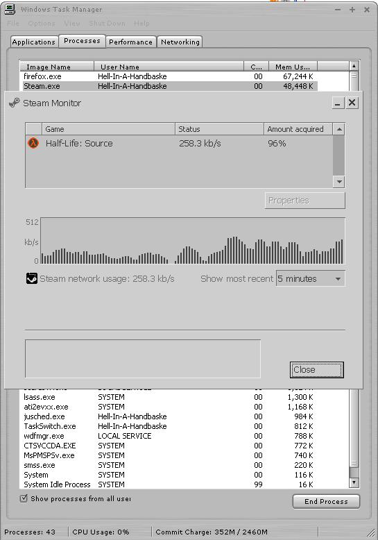 LOC Veteran Posted November 16, 2004 Veteran Share Posted November 16, 2004 I have my NIS firewall, as well as windows firewall turned off. Steam freezes up when I try to create a new account. This is driving me mad. It jumps up to using 50-75% of my cpu... :angry: 584932879[/snapback] I know you aren't gonna probably like this one, but why do you have so much stuff running in the background when you are launching it? 65 processes?!?! Steam.exe is only using a little memory, but you are using nearly 500 megs of your memory from other things? (Unless there is a process that's sucking it all up at 100% cpu) Link to comment Share on other sites More sharing options...