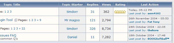 Chode Posted November 29, 2004 Share Posted November 29, 2004 Ok, here is a photoshop suggestion for the layout. I think this is slightly more efficient looking, and also doesn't make it seem that the thread is prioritised by it's rating. Link to comment Share on other sites More sharing options...
