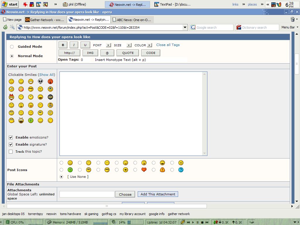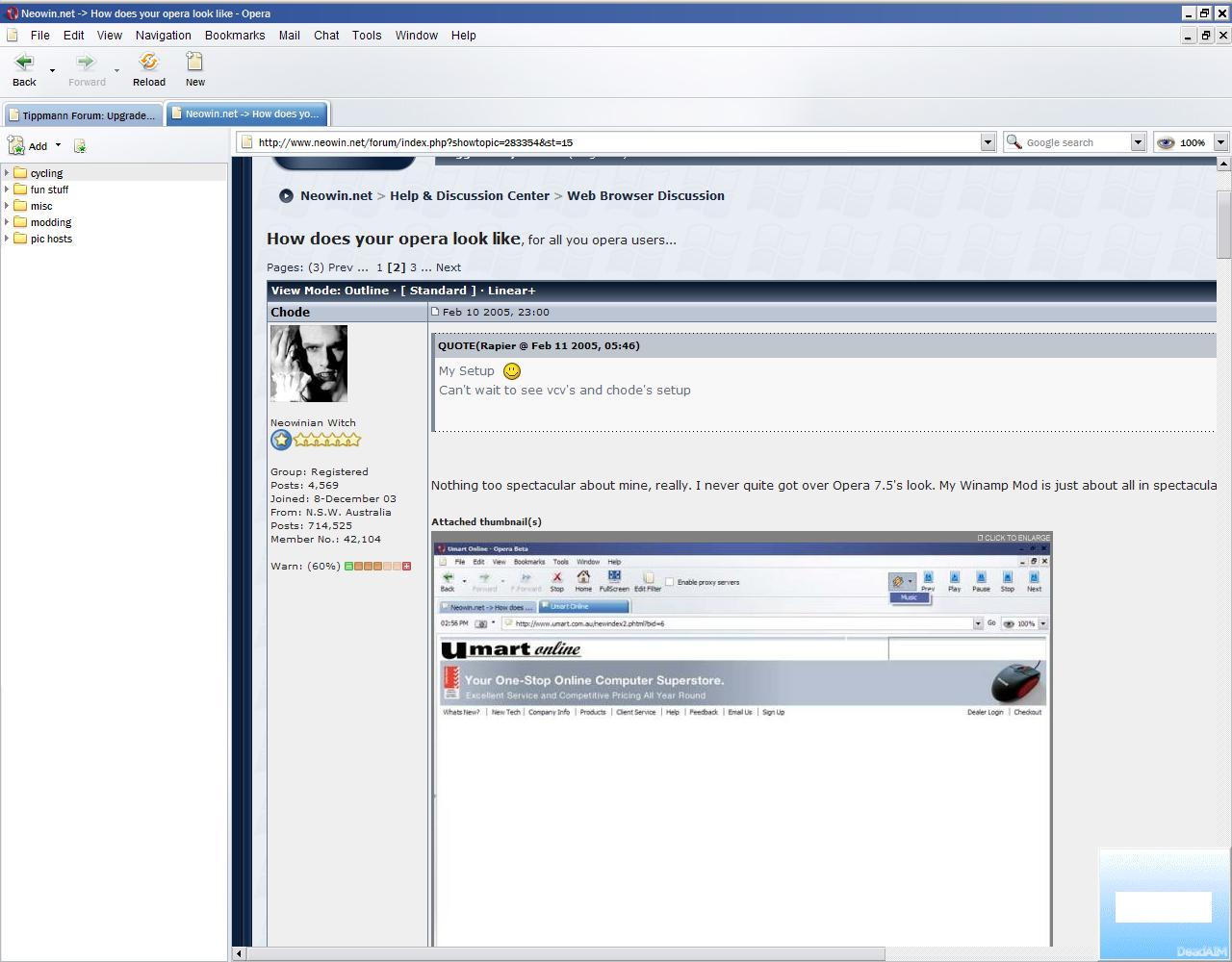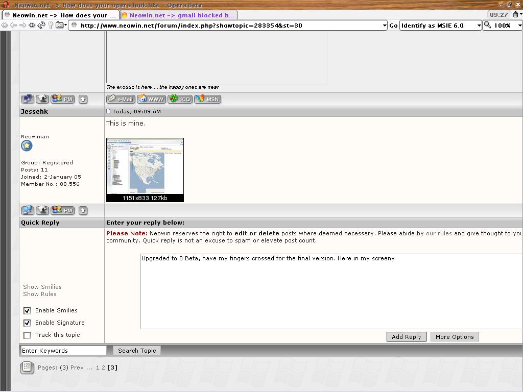 Chode Posted February 26, 2005 Share Posted February 26, 2005 Here is my new one. Opera 8 Beta 2. The skin is "Opera 7 Standard". Link to comment Share on other sites More sharing options...