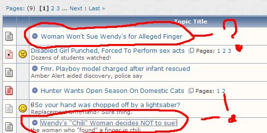 Musashi22 Posted April 13, 2005 Share Posted April 13, 2005 Follow-up to the Wendy Finger Story I posted a while back... Woman Won't Sue Wendy's for Alleged FingerSAN JOSE, Calif. - A woman who claimed she scooped up a human finger along with her chili at a Wendy's restaurant has decided not to sue the fast-food chain. Anna Ayala dropped her claim because it "has caused her great emotional distress and continues to be difficult emotionally," said her attorney, Jeffrey Janoff. Ayala, 39, claimed she found the 1 1/2-inch long fingertip on March 22 while dining at a Wendy's restaurant in San Jose. She later filed a claim with the franchise owner, Fresno-based JEM Management Corp., which her attorney had said was the first step before filing a lawsuit. Phone calls to Ayala's house went unanswered Tuesday. Investigators searched her Las Vegas home last week as part of their investigation into how a finger ended up in the chili. Wendy's spokesman Denny Lynch declined to comment on Ayala's decision to drop the lawsuit but said a reward hot line to receive tips will remain open. Wendy's has offered $50,000 to the first person who can provide verifiable information that identifies the origin of the finger. "It's very important to us to find out what really happened at the restaurant," Lynch said. "We will continue to fully cooperate with the police investigation." Wendy's maintains the finger did not enter the food chain in its ingredients. None of the employees at the San Jose store had lost any fingers, and no suppliers of Wendy's ingredients reported any hand or finger injuries, the company said. The Santa Clara County coroner's office used a partial fingerprint to search for a match in an electronic database but came up empty. DNA testing is still being conducted on the finger. Source Link to comment Share on other sites More sharing options...