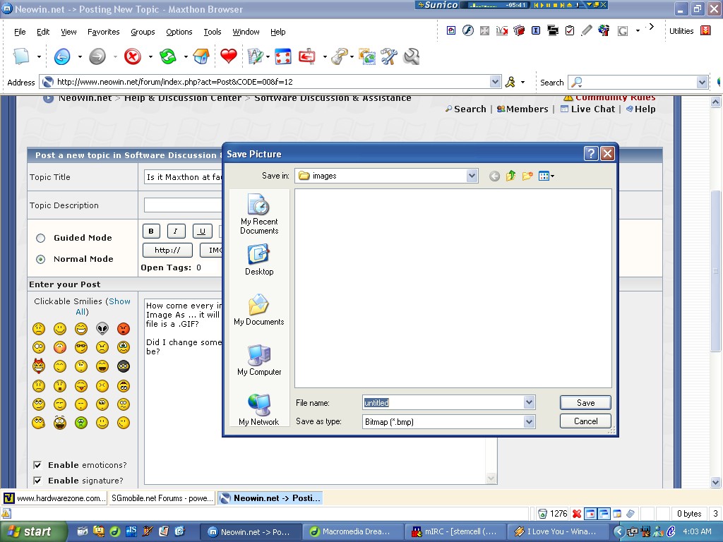 BryanChung Posted May 15, 2005 Share Posted May 15, 2005 How come every image I try to save from a webpage, I right click and Save Image As ... it will only save as 'untitled' .BMP? Even if the properties show me the file is a .GIF? Did I change some settings accidentally I did not know or what can the problem be? Link to comment Share on other sites More sharing options...