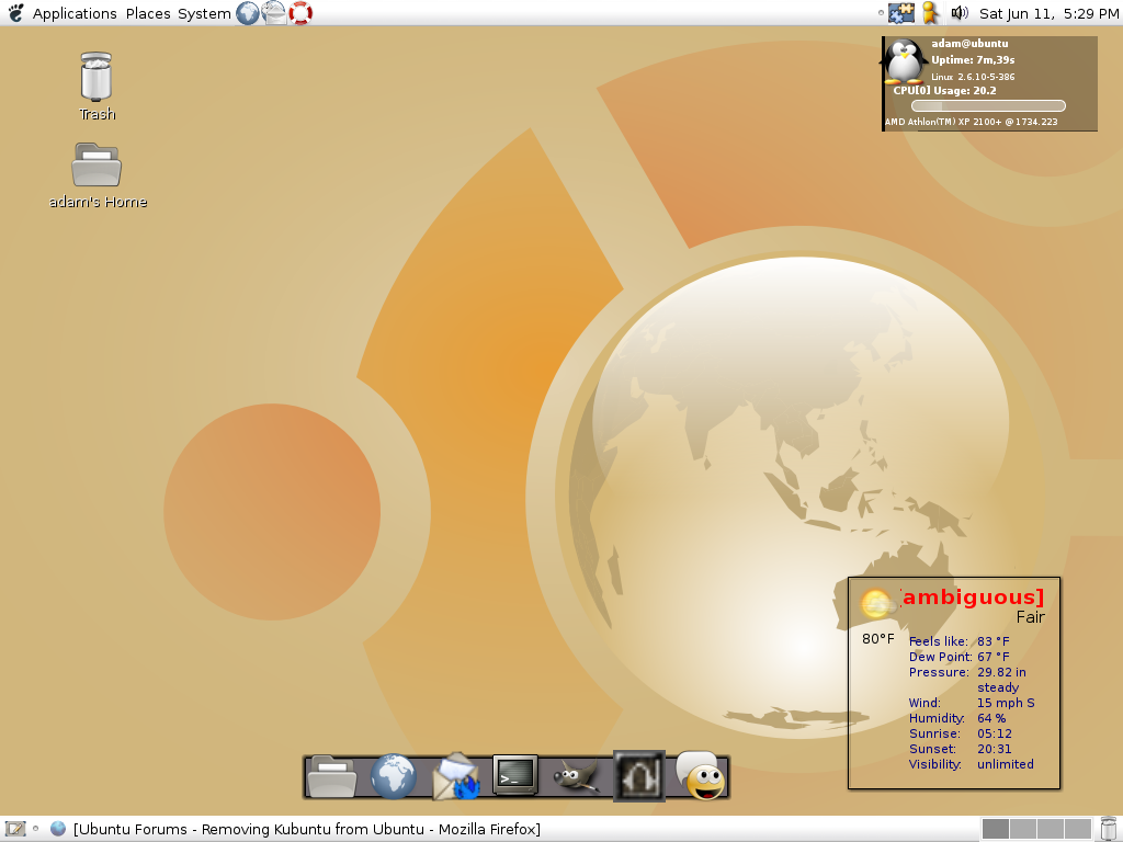 thechitowncubs Posted June 12, 2005 Share Posted June 12, 2005 Ubuntu Linux 5.04Theme: Controls - SmoothMilk, Window Border - Milk Icons: Gartoon Programs: gDesklets (with StarterBar), Liferea Feed Reader in System Tray My newest desktop: 586051618[/snapback] you sir have a tiny monitor Link to comment Share on other sites More sharing options...